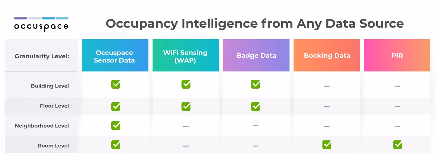 The real question isn’t WiFi or sensors - it's having the flexibility to choose the solution that's best for your situation. Occuspace brings these data sources together into one AI-powered platform, giving teams a complete and flexible way to measure utilization without managing separate tools or workflows.